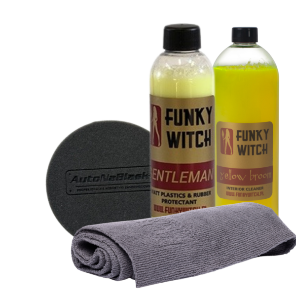Dużym powodzeniem cieszy się np. Funky Witch zestaw do czyszczenia i pielęgnacji tworzyw wewnątrz. W opakowaniu uwzględniliśmy preparat typu APC (uniwersalny środek czyszczący) oraz kosmetyk ochronny o matowym wykończeniu do elementów z plastiku i gumy. Dobraliśmy do nich uniwersalną mikrofibrę od WORK STUFF oraz nasz autorski aplikator.