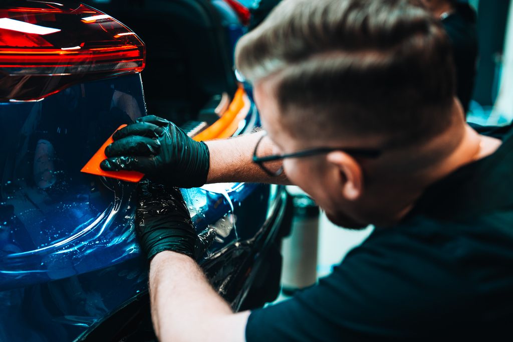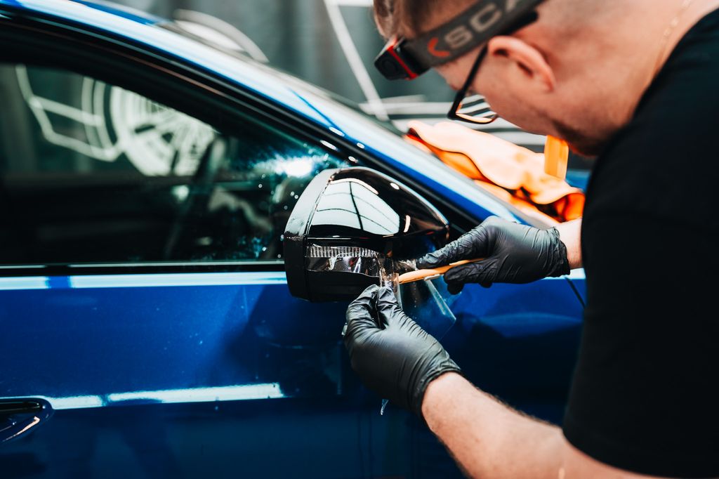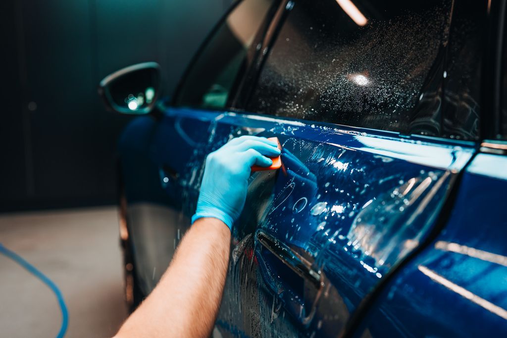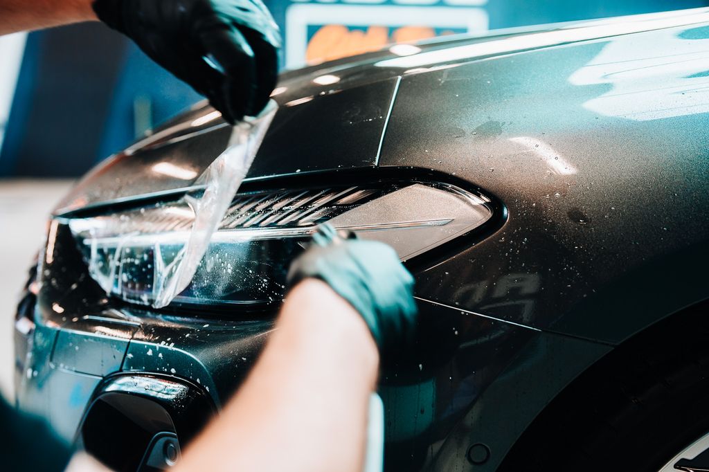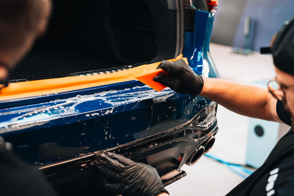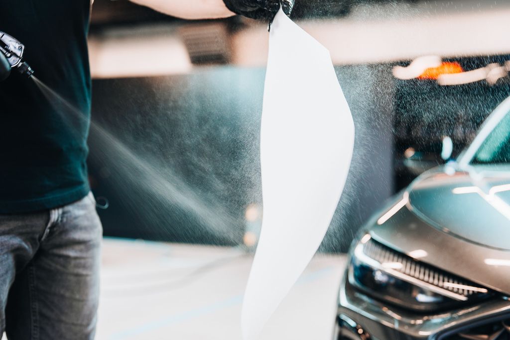 - Podczas odrywania linera spryskaj stronę klejącą folii oraz element samochodu.