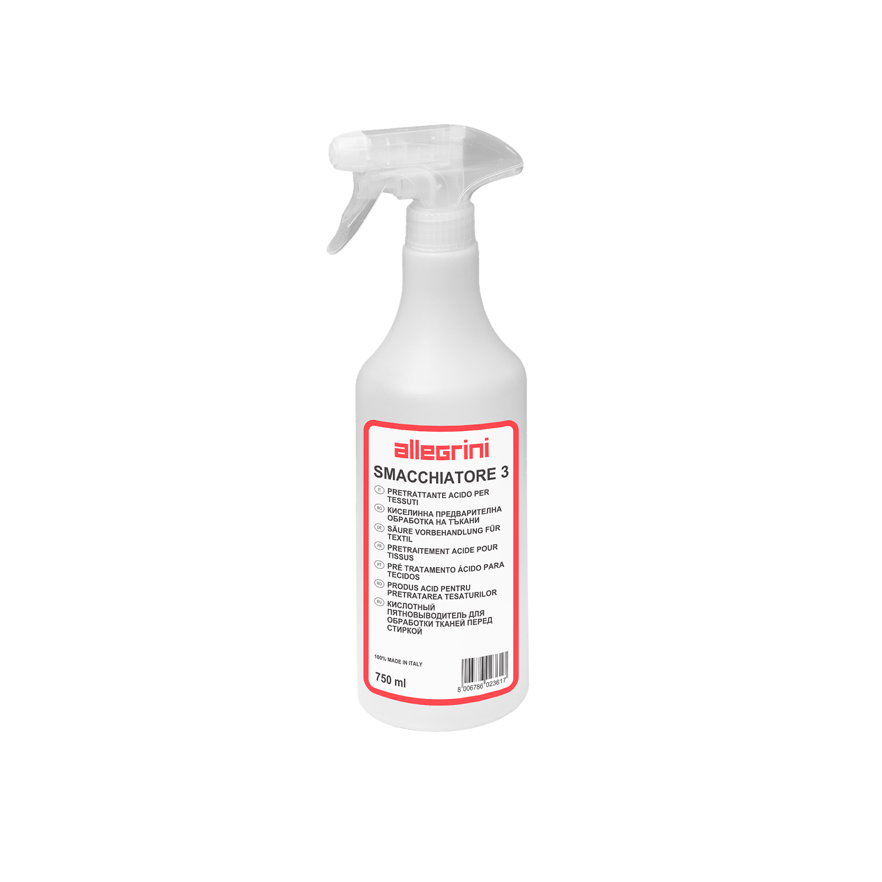 Allegrini SMACCHIATORE 3 to gotowy do użycia, profesjonalny odplamiacz przeznaczony do usuwania trudnych, mineralnych zabrudzeń z tkanin. Skutecznie eliminuje plamy z rdzy, cementu, patyny i szarego aluminium bez uszkadzania materiału. Niezastąpiony w pralniach przemysłowych, budownictwie i warsztatach.