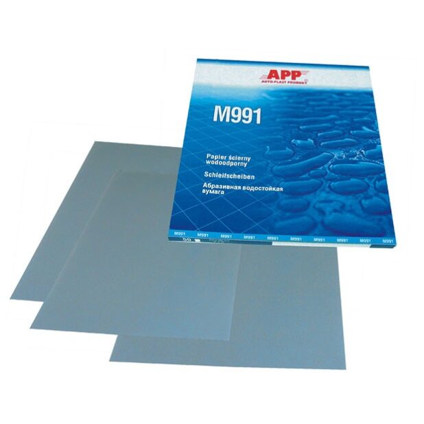 Papier ścierny wodoodporny 230mmx280mm przeznaczony do szlifowania ręcznego na mokro. Znajduje zastosowanie wszędzie tam gdzie wymagana jest najwyższa jakość szlifowanej powierzchni. Zalety: – zastosowane ostre ziarno z węglika krzemu pozwala na wyjątkowo ostre ścieranie powierzchni, – spoiwo z żywic syntetycznych zapewnia optymalne zabezpieczenie przed wykruszaniem się ziarna, – specjalny elastyczny, impregnowany papier odporny na rozerwania ze strukturą antypoślizgową, nie zwija się w wodzie i nie wymaga długotrwałego moczenia, – jednolite rozłożenie ziarna oraz nasyp zamknięty pozwala na równomierne ścieranie powierzchni tworząc idealne podłoże dla lakierów bazowych i nawierzchniowych.