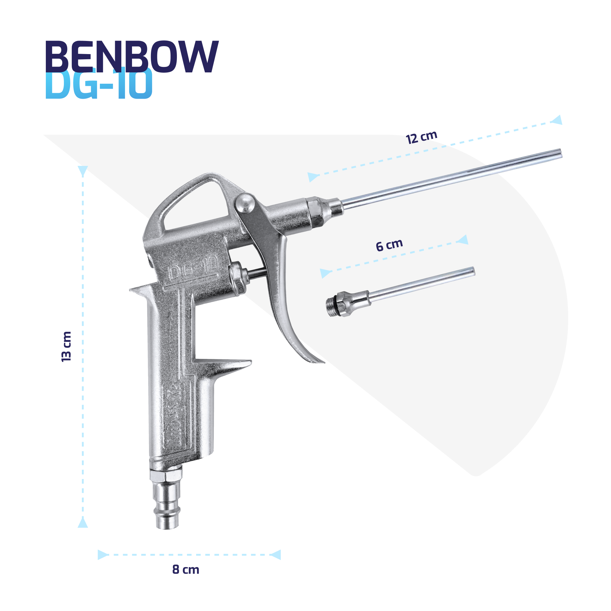 BenBow 041 Classic to solidny pistolet przedmuchowy DG10 z dwiema wymiennymi dyszami (8 i 14 cm), idealny do czyszczenia, osuszania i usuwania kurzu. Wykonany ze stali, sprawdzi się w profesjonalnych i domowych warunkach. Dzięki ergonomicznemu uchwytowi i szybkiemu podłączeniu jest wygodny i praktyczny w codziennym użytkowaniu.
