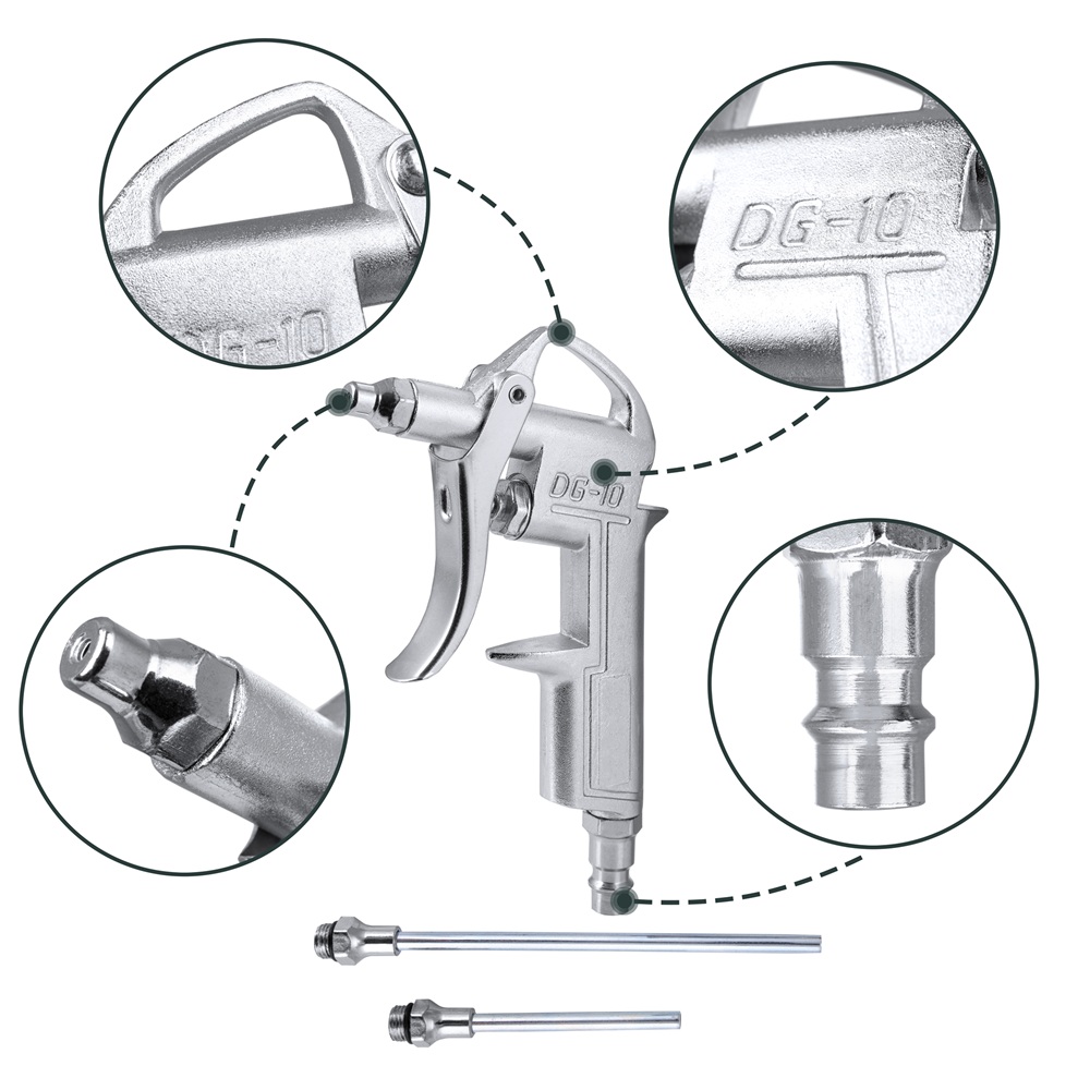 BenBow 041 Classic (DG10) to trwały i wszechstronny pistolet przedmuchowy zaprojektowany do efektywnego usuwania kurzu, osuszania powierzchni oraz oczyszczania trudno dostępnych miejsc. W zestawie znajdują się dwie wymienne dysze o długości 8 cm i 14 cm, które pozwalają dostosować strumień powietrza do konkretnego zadania. Ergonomiczny uchwyt, solidna stalowa konstrukcja i standardowy gwint 1/4” zapewniają wygodną obsługę i kompatybilność z większością instalacji pneumatycznych.