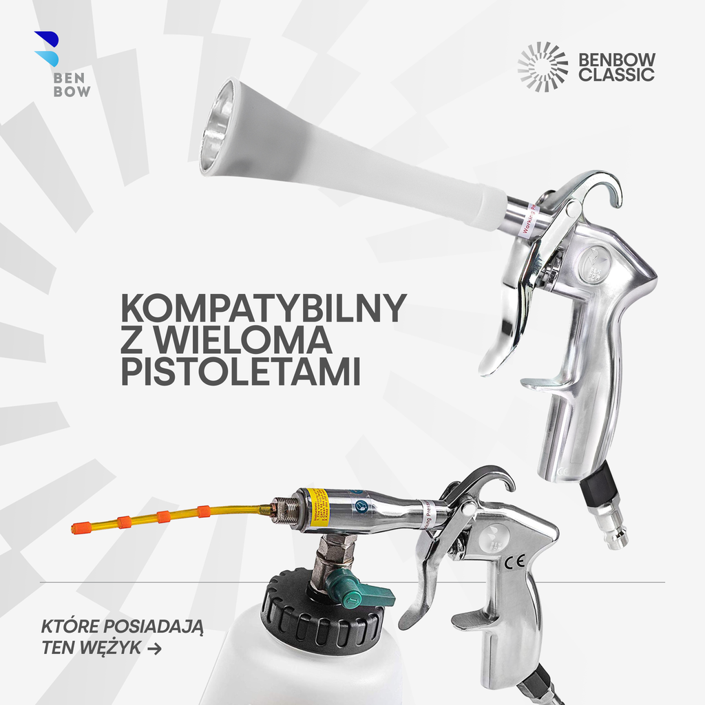 BenBow 016 Classic to wzmocniona dysza serwisowa przeznaczona do pistoletów czyszczących i przedmuchowych z serii BenBow Classic. Wykonana z wytrzymałego plastiku i wyposażona w stalowy pierścień wzmacniający, łączy lekkość z podwyższoną trwałością, zapewniając dłuższą żywotność nawet przy intensywnej eksploatacji. Pasuje do najpopularniejszych modeli, takich jak 002, 003, 004 i 008, oferując skuteczne usuwanie zabrudzeń z tapicerki i wnętrz pojazdów.