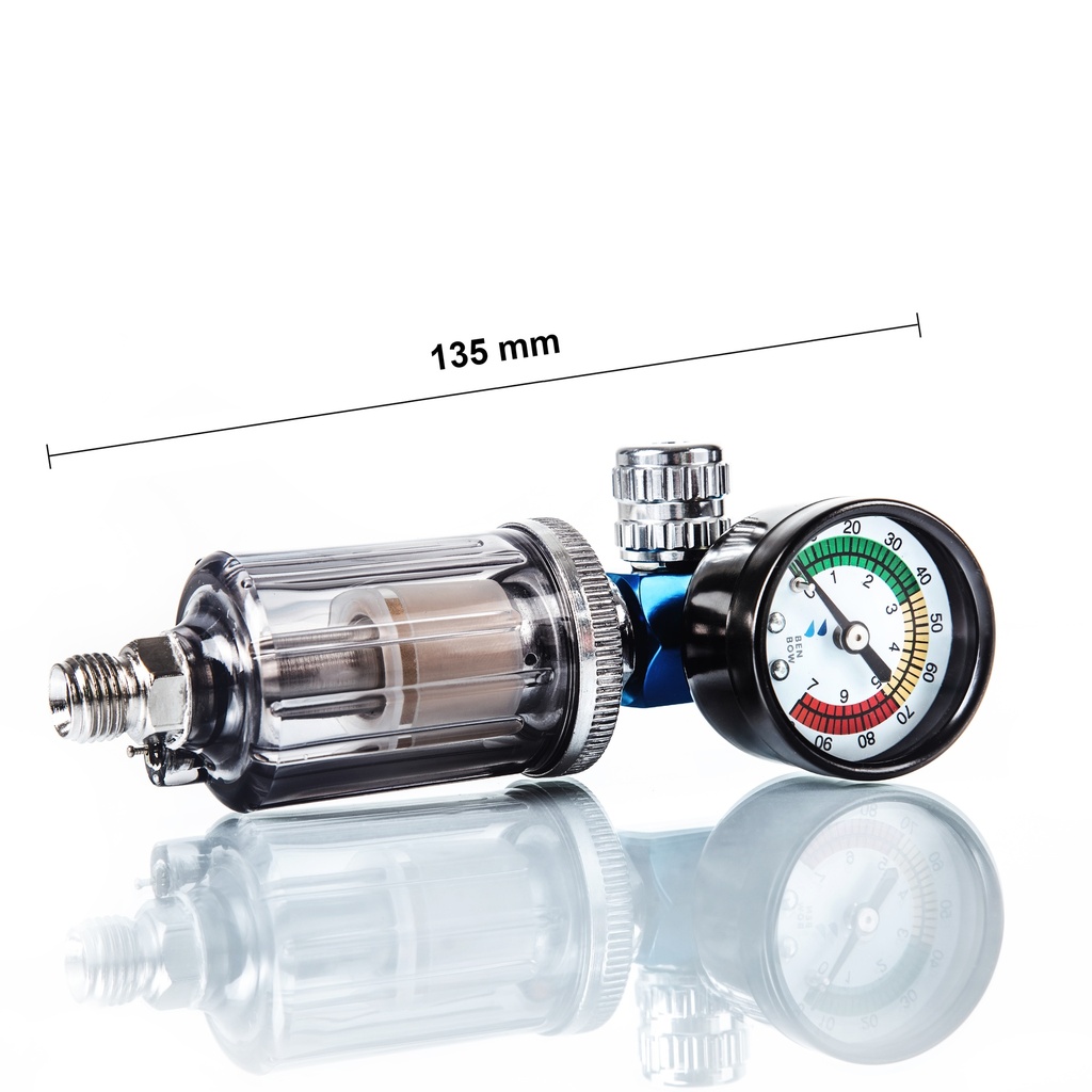 Zamontuj regulator bezpośrednio przy pistolecie lakierniczym, czyszczącym lub przedmuchowym za pomocą złącza 1/4” BSP. Ustaw odpowiednie ciśnienie przy pomocy pokrętła i obserwuj wartości na wbudowanym manometrze. Regularnie opróżniaj zbiornik odwadniacza, korzystając z zaworu spustowego.