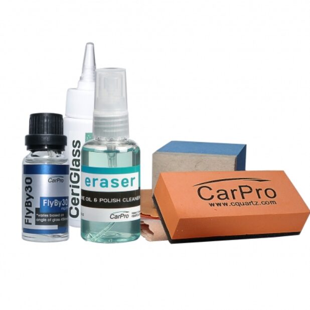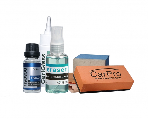 CarPro FlyBy30 Kit to kompletny zestaw do aplikacji zaawansowanej powłoki na szyby samochodowe. W jednym pudełku otrzymujesz wszystko, co niezbędne do przygotowania powierzchni i nałożenia zabezpieczenia.