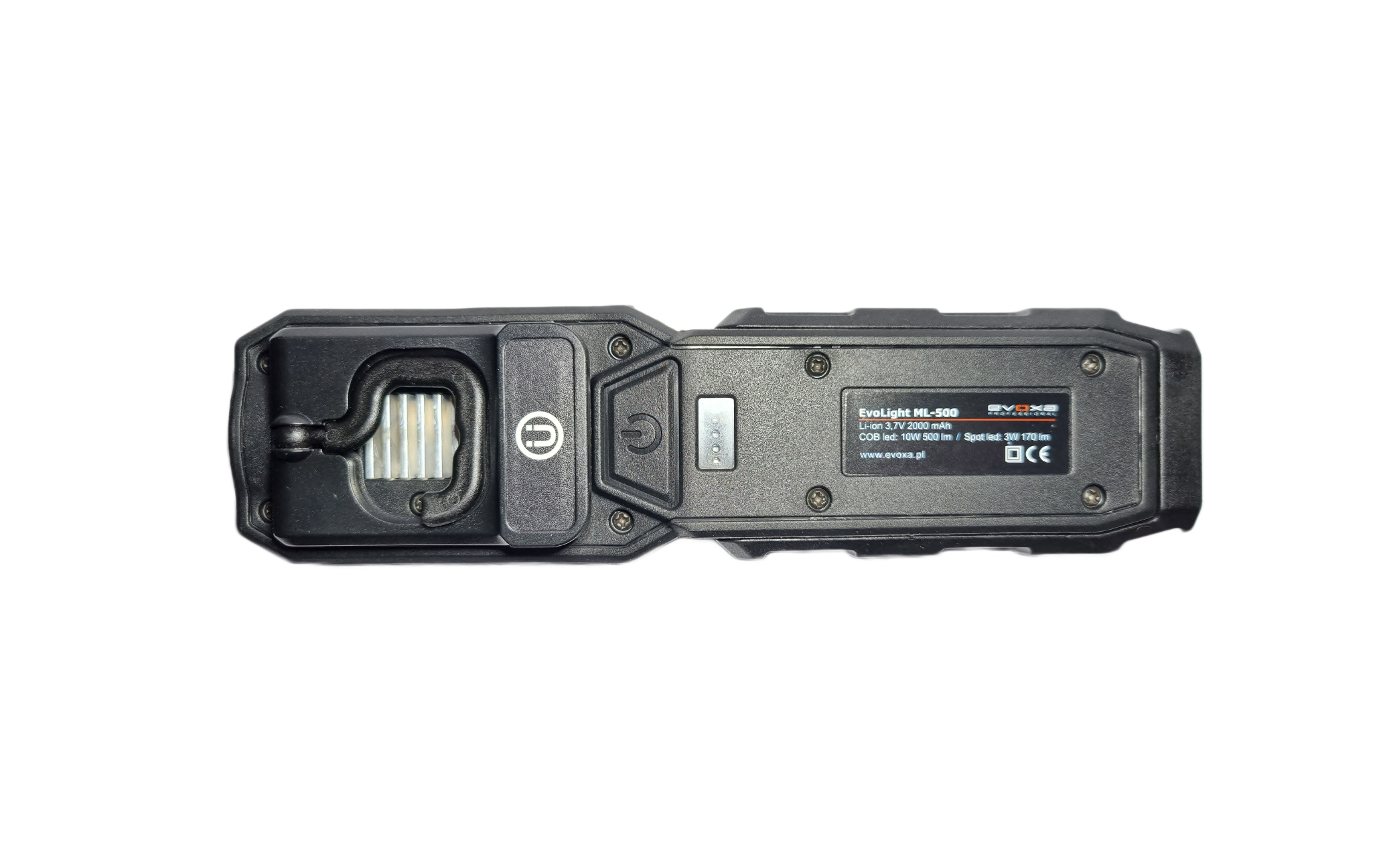 - EvoLight ML-500 oferuje cztery różne sposoby mocowania: dwa magnesy, zawieszkę, klips oraz uchwyt wychylny z magnesem i gwintem do statywu. Dzięki temu można dostosować oświetlenie do różnych sytuacji roboczych.
