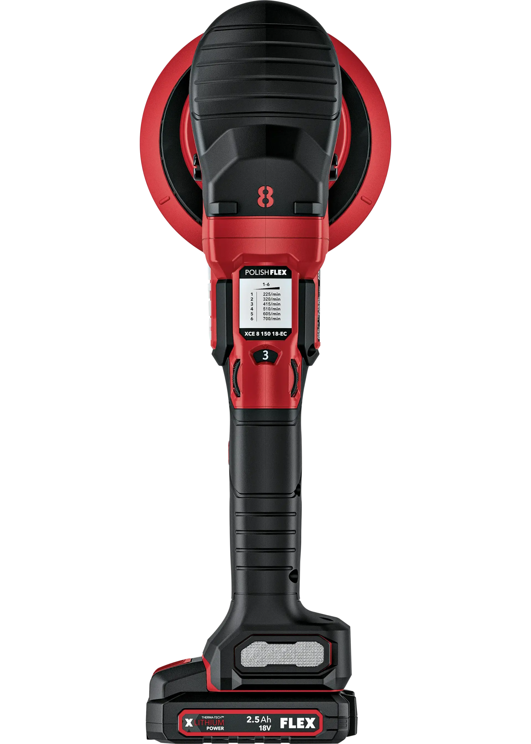 FLEX XCE 8 150 18-EC Set to nowoczesna, akumulatorowa polerka mimośrodowa nowej generacji, stworzona z myślą o profesjonalistach w detailingu, lakiernictwie, przemyśle motoryzacyjnym, żeglarskim i lotniczym. Dzięki bezszczotkowemu silnikowi, nowej przekładni i zaawansowanej elektronice utrzymującej stałe parametry pracy, polerka oferuje wydajność na poziomie maszyn sieciowych – bez ograniczeń kabla.