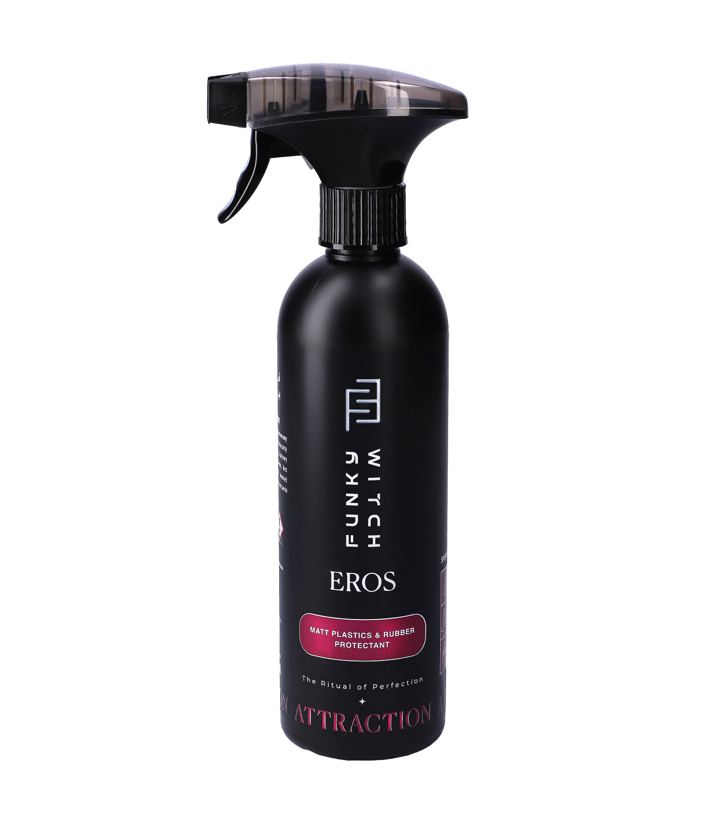 Funky Witch EROS Matt Dressing 500ml to wysokiej jakości preparat oparty na polimerach, przeznaczony do pielęgnacji i ochrony wewnętrznych elementów plastikowych oraz gumowych w samochodzie