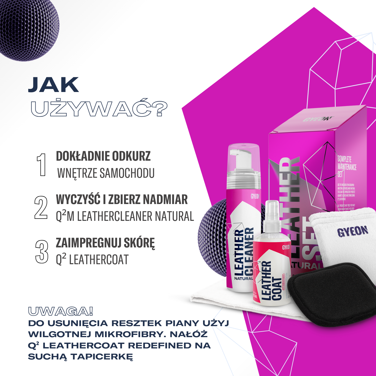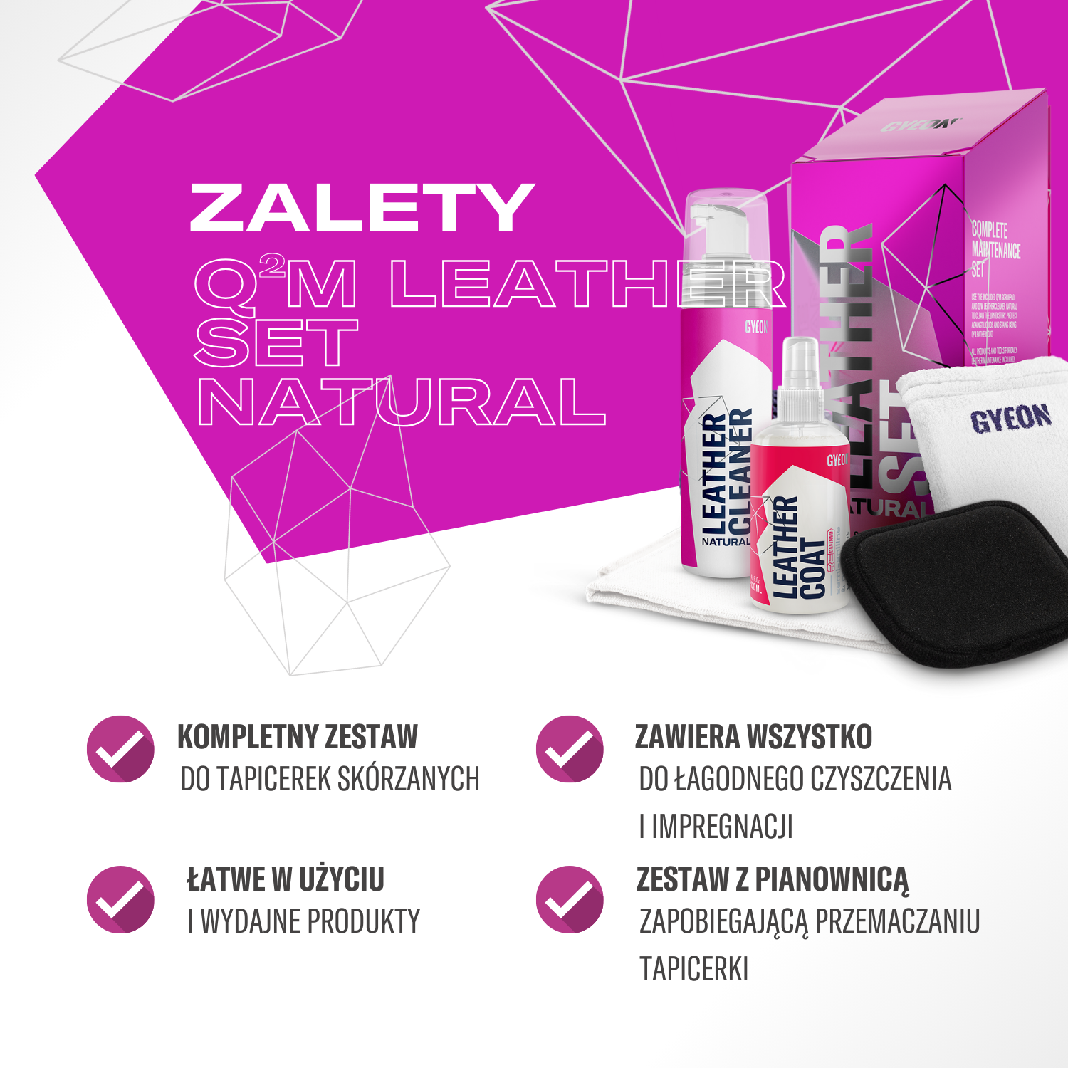 Gyeon Q²M LeatherSet Natural to profesjonalny zestaw stworzony z myślą o luksusowych i sportowych samochodach wyposażonych w delikatne tapicerki skórzane typu Semi-anilina i Nappa. Można go używać na każdego rodzaju współczesnej tapicerce skórzanej. Dzięki unikalnym formułom produktów oraz dołączonym akcesoriom, zapewnisz swojej tapicerce perfekcyjne oczyszczenie i długotrwałą ochronę. To kompleksowe rozwiązanie, które przywraca skórze jej naturalny wygląd, zapewniając przy tym trwałą ochronę przed zabrudzeniami, wilgocią i przebarwieniami.