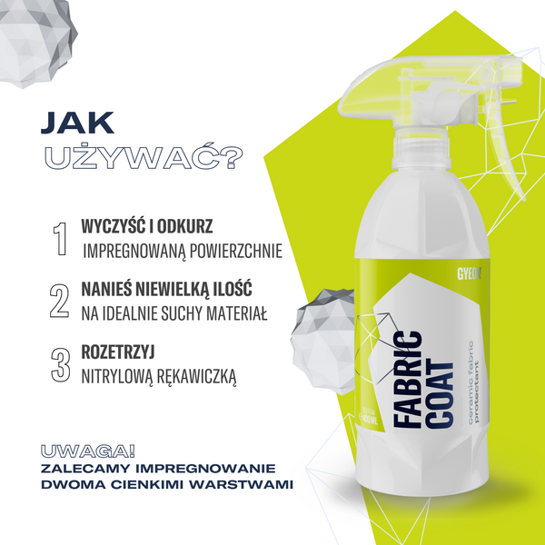 GYEON Q2 FabricCoat to pierwsza na rynku w pełni funkcjonalna powłoka ochronna do tkanin z zawartością SiO₂. Dzięki nowoczesnej formule produkt tworzy silną, niewidzialną barierę, chroniącą materiały przed wodą, zabrudzeniami oraz szkodliwym promieniowaniem UV. Doskonale sprawdza się w samochodach – do zabezpieczenia tapicerki, dywaników, dachów cabrio czy innych tekstyliów narażonych na wilgoć i zabrudzenia. Trwałość powłoki sięga nawet 6 miesięcy, a powierzchnia pozostaje świeża i łatwa w czyszczeniu.