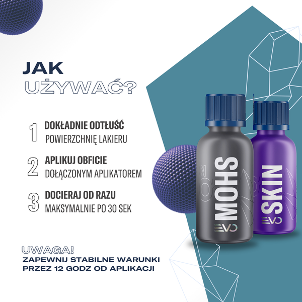 Po wyschnięciu zastosuj warstwę wierzchnią Q² Skin EVO, aby wzmocnić hydrofobowość i połysk.