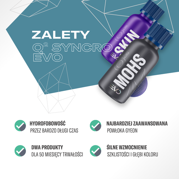 Gyeon Q² SYNCRO EVO to innowacyjny, dwuwarstwowy system powłok ceramicznych, zapewniający lakierowi „drugą skórę”. Unikalna technologia polisilazanów modyfikowanych fluorem gwarantuje wyjątkową trwałość, odporność chemiczną i efekt hydrofobowy. Dzięki warstwie wierzchniej Q² Skin EVO lakier zyskuje głębię koloru, wysoki połysk i łatwość czyszczenia.