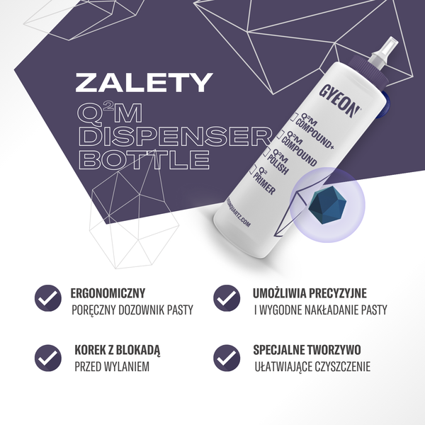GYEON Q²M Dispenser Bottle to praktyczny i trwały dozownik zaprojektowany z myślą o pasjonatach detailingu i profesjonalistach. Lekka butelka o pojemności 300 ml umożliwia dokładne i precyzyjne dozowanie past polerskich, a elastyczny materiał pozwala na łatwe kontrolowanie ilości nakładanego produktu.