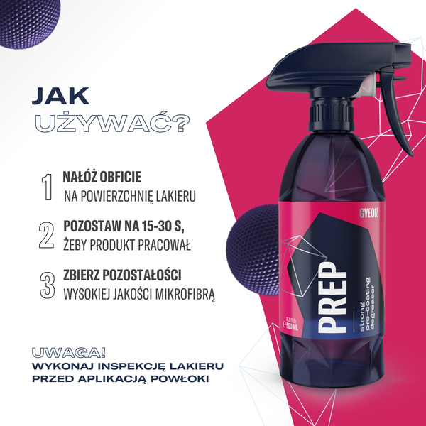 GYEON Q²M Prep to zaawansowany odtłuszczacz klasy premium, stworzony z myślą o profesjonalnym przygotowaniu powierzchni przed aplikacją powłok ochronnych. W przeciwieństwie do standardowych IPA, jego formuła nie tylko podnosi, ale skutecznie rozpuszcza oleje, pozostałości past polerskich, wosków i sealantów, zapewniając perfekcyjnie czystą powierzchnię.