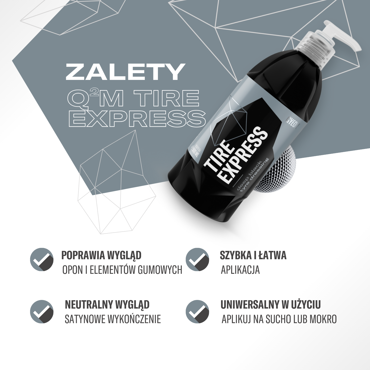 • Opony: Q²M Tire Express jest idealny do pielęgnacji opon, nadając im estetyczny, matowy wygląd.