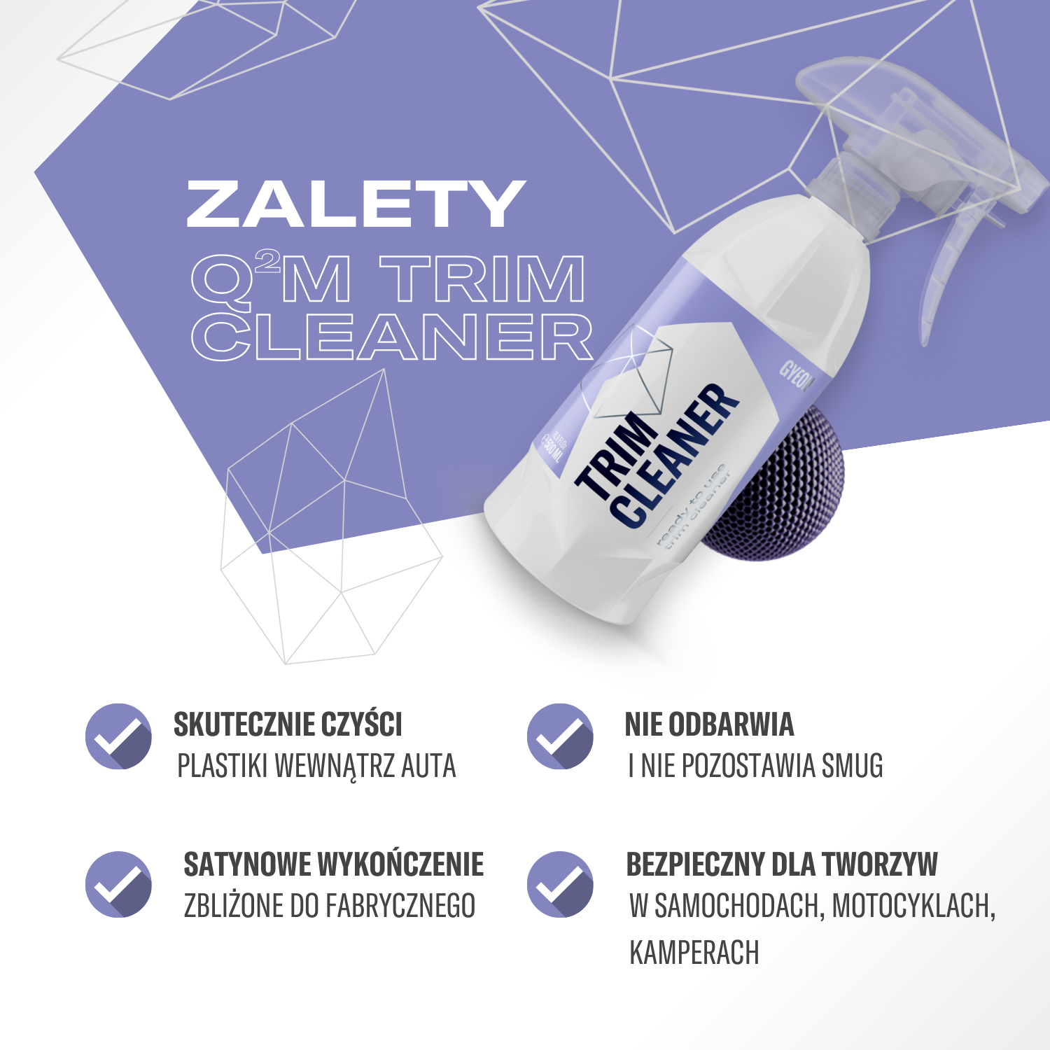 GYEON Q²M TrimCleaner 500 ml to idealny wybór do codziennej pielęgnacji wnętrza samochodu. Skuteczny, delikatny i bezpieczny – usuwa zabrudzenia, pozostawiając naturalne, matowe wykończenie i idealną bazę pod dalszą ochronę.