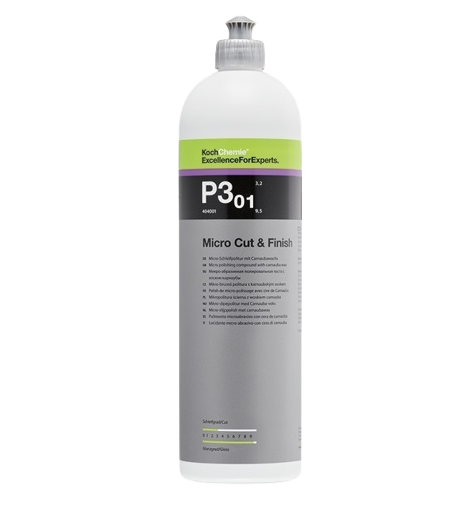 Koch Chemie Micro Cut & Finish P3.01 jest najnowszej generacji maszynową mikro-politurą polerską przeznaczoną do trwałego usuwania smug, hologramów, drobnych rys i śladów po matowaniu medium o gradacji P3000 z wszystkich systemów lakierniczych (w tym odpornych na zarysowania) przy jednoczesnym długotrwałym uszczelnieniu z wysokim stopniem połysku i gładkością wykończenia. Dzięki zastosowaniu wysoce wyspecjalizowanym bardzo jednorodnym cząsteczkom ściernym zapewnia genialnie trwałe wykończenie o wysokim połysku, które jest tworzone w ekstremalnych warunkach oświetleniowych, nawet na ciemnych i podobnie delikatnych odcieniach. Hologramy i drobne zadrapania są usuwane mechanicznie, a nie, jak często przez maskowanie rys na powierzchni. Koch Chemie Micro Cut & Finish P3.01 jest ekonomiczną, łatwą w polerowaniu i usuwaniu mikro-politurą. Zawiera wosk carnauba i nieutleniające się silikony.