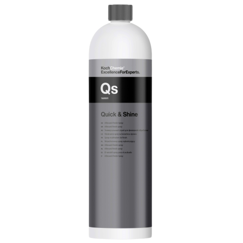 Wszechstronny środek do wszystkich gładkich i lakierowanych powierzchni (lakiery samochodowe, lakierowane drewno, szkło, elementy plastikowe, deska rozdzielcza, lakierowane meble i instrumenty muzyczne, powierzchnie ze stali stopowej itp.). Czyści, pielęgnuje i konserwuje w trakcie tylko jednej operacji. Nadaje powierzchniom głębię koloru i olśniewający połysk bez smug. Szybko i łatwo usuwa odciski palców i lekkie zabrudzenia. Wyczyszczone elementy są zakonserwowane w sposób wodo- i plamoodporny oraz zabezpieczone przed szybkim ponownym zabrudzeniem (efekt lotosu). Koch Chemie Qs Quick & Shine szybko się wchłania, co ułatwia jego zastosowanie. Nałożone wcześniej politury i woski zostają zachowane. Szczególnie dobry do szybkiego wykończenia powierzchni przedmiotów prezentowanych w salonach wystawowych lub na targach oraz do szybkiego odświeżania pojazdów. Koch Chemie Qs Quick & Shine posiada dopuszczenie firmy Daimler.