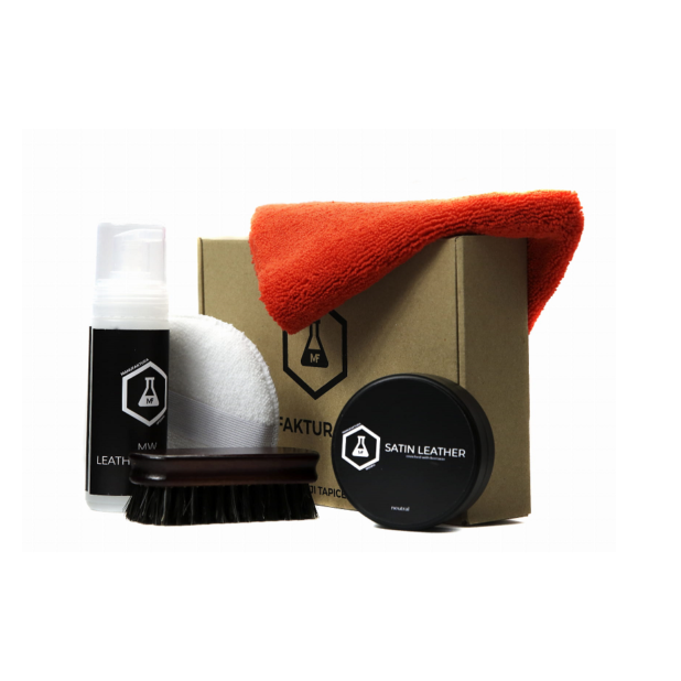 - Na suchą i czystą powierzchnię skóry nałóż za pomocą aplikatora dołączonego do zestawu wosk Satin Leather i dotrzyj mikrofibrą.