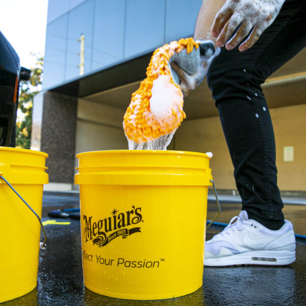 - Mycie pojazdu – Używając rękawicy Meguiar’s Hybrid Wash Mitt lub innej wysokiej jakości rękawicy z mikrofibry, umyj pojazd sekcja po sekcji, zaczynając od góry.