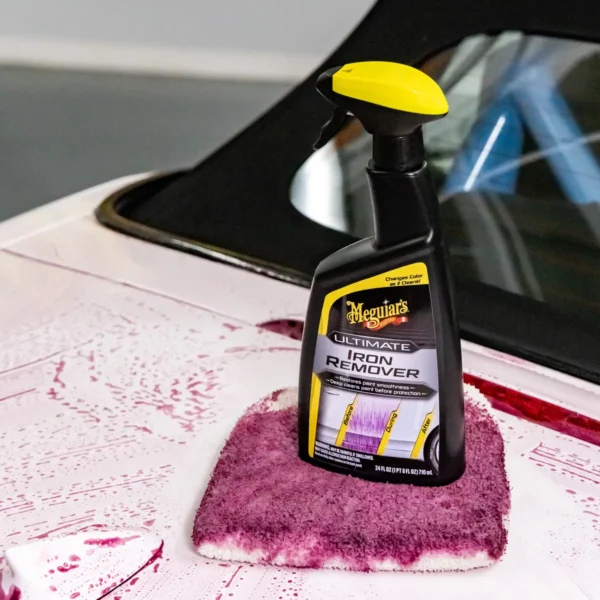 Meguiar’s Ultimate Iron Remover skutecznie usuwa rdzę lotną, pył hamulcowy i zanieczyszczenia metaliczne z lakieru, szyb i chromowanych powierzchni. Zmienia kolor podczas działania i przygotowuje auto do dalszych zabiegów. Bezpieczny dla powierzchni i niezwykle łatwy w użyciu.