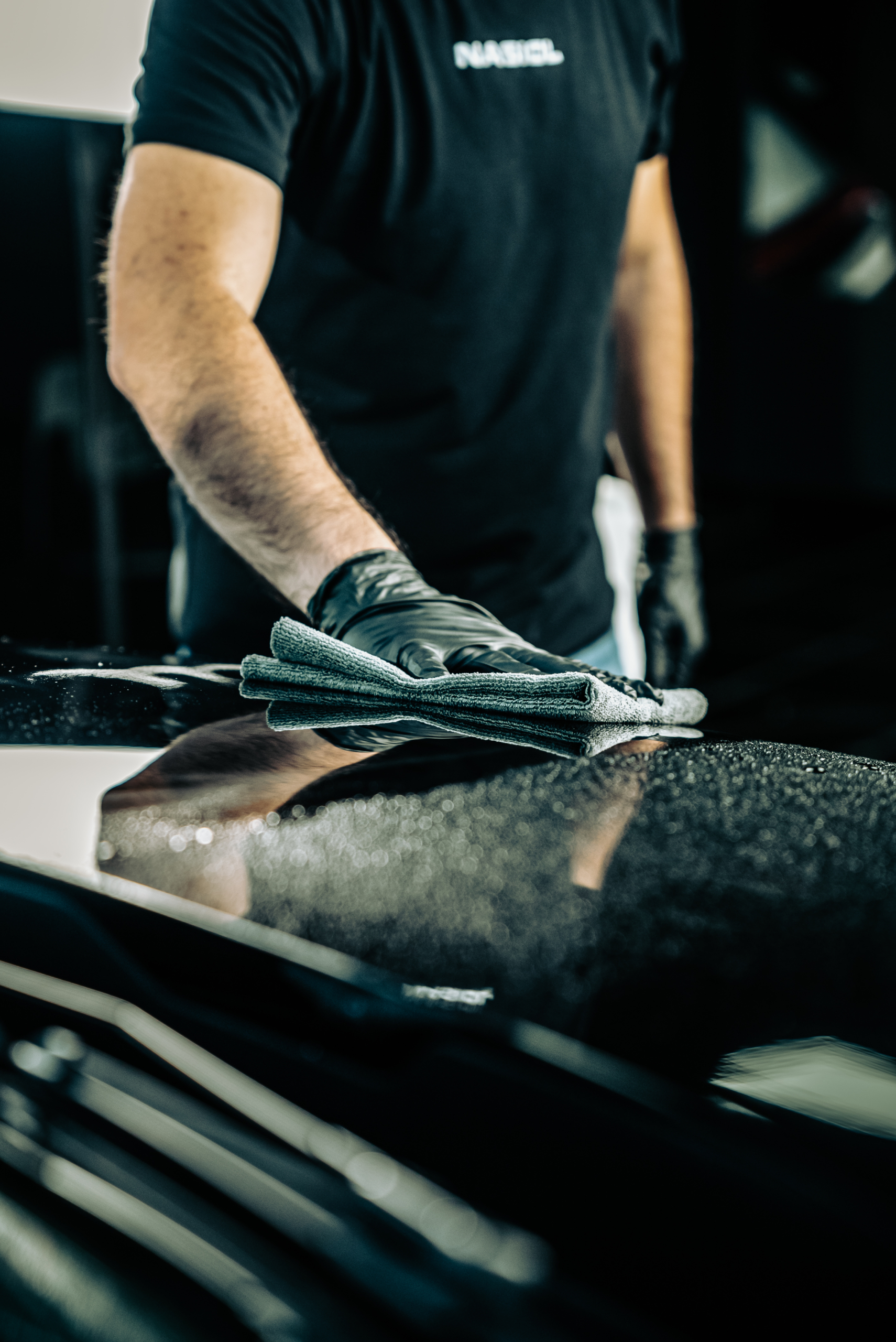 - Nanieś produkt bezpośrednio na powierzchnię (maska ok 10 psiknięć) a następnie delikatnie ruchami okrężnymi osusz pojazd za pomocą ręcznika NASIOL Twist Car Drying Towel