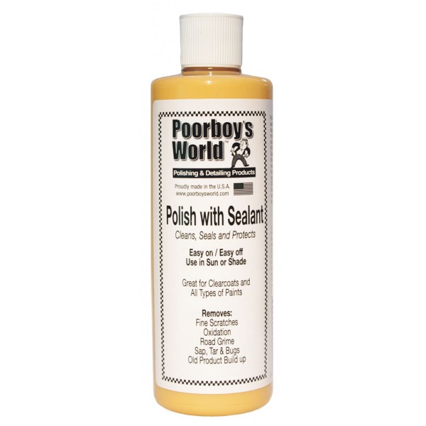 POORBOY’S Polish with Sealant to produkt typu AIO (All In One) . Za pomocą jednej łatwej aplikacji oczyszcza lakier oraz zabezpiecza go. Nie zawiera ścierniwa, oczyszcza skutecznie lakier bazując na chemicznych właściwościach czyszczących. Dzięki zawartości syntetycznych polimerów zapewnia ochronę oraz głębię koloru i połysk. Idealny wybór dla osób nie mogących poświęcić dużej ilości czasu na przeprowadzenie złożonego procesu pielęgnacji lakieru kilkoma różnymi środkami.