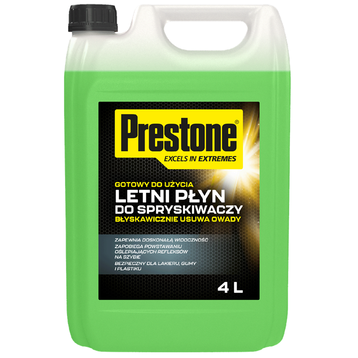 PRESTONE Letni Płyn do Spryskiwaczy 4L to niezastąpiony produkt na wakacyjne podróże. Gwarantuje perfekcyjnie czystą szybę bez smug i refleksów, zwiększając bezpieczeństwo i komfort jazdy w każdych warunkach.