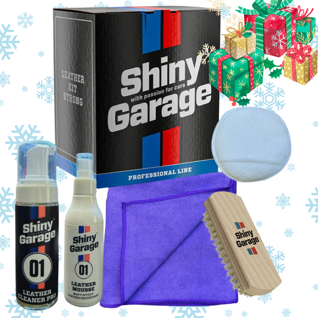 Shiny Garage Leather Kit Strong to kompletny zestaw do skutecznego czyszczenia i pielęgnacji tapicerki skórzanej o lekkim i średnim stopniu zabrudzenia. Zawiera mocny środek czyszczący, odżywczy krem Leather Mousse oraz akcesoria profesjonalnej jakości, które ułatwiają bezpieczną i efektywną pracę. Idealny jako praktyczny prezent dla osób dbających o estetykę wnętrza swojego auta.