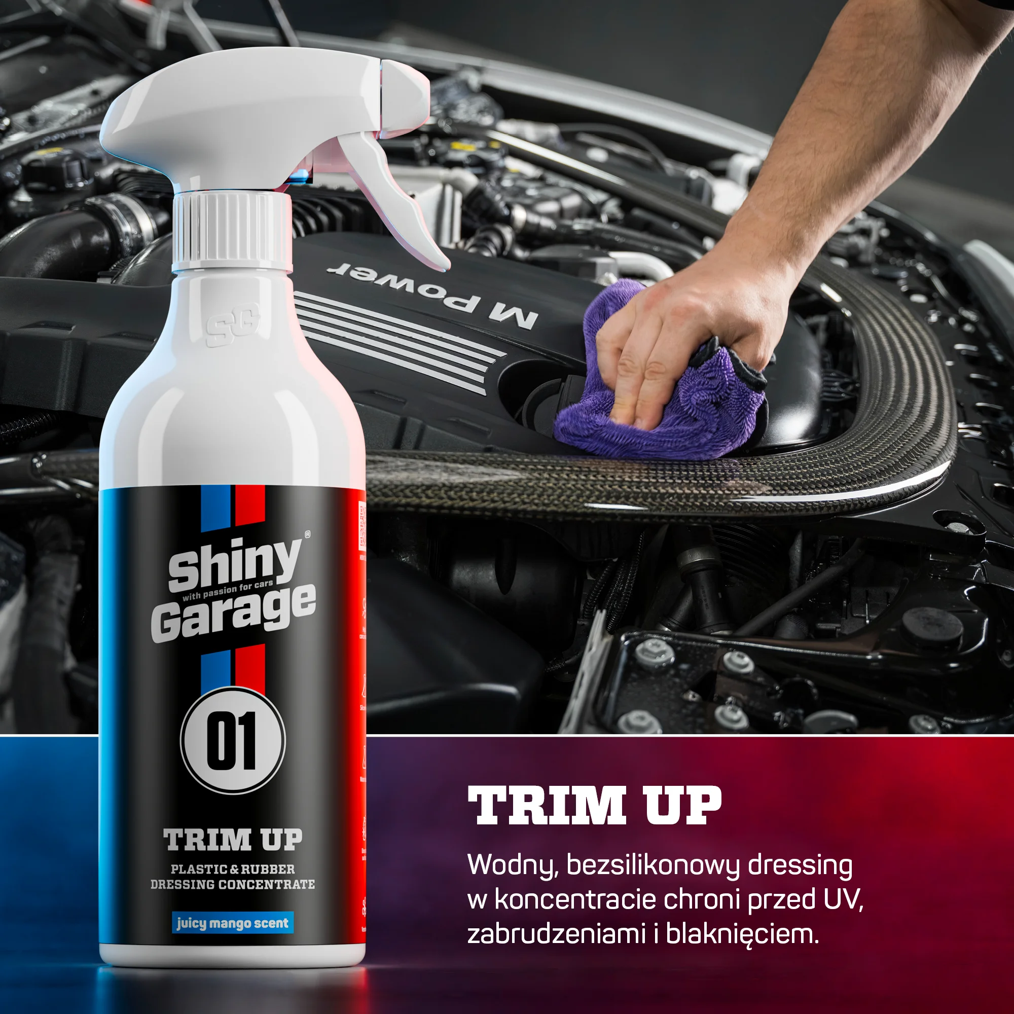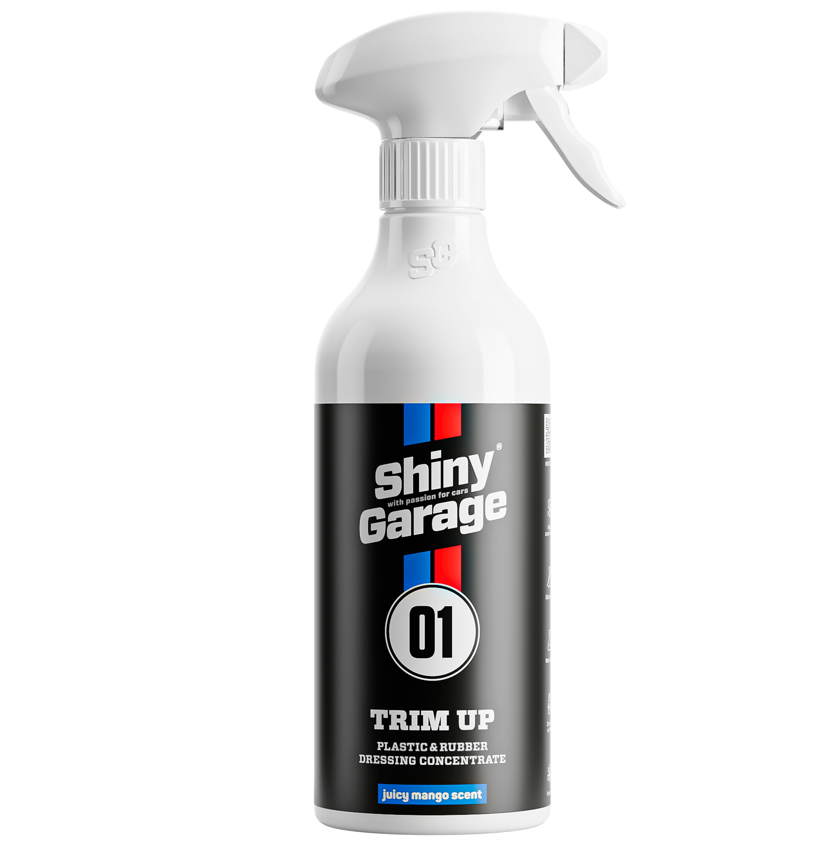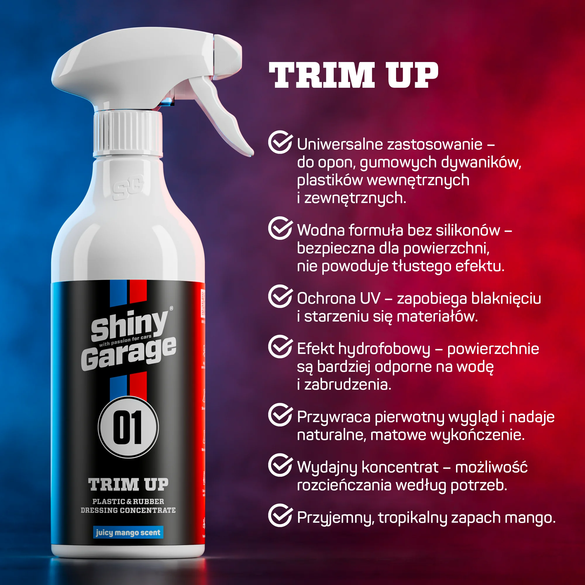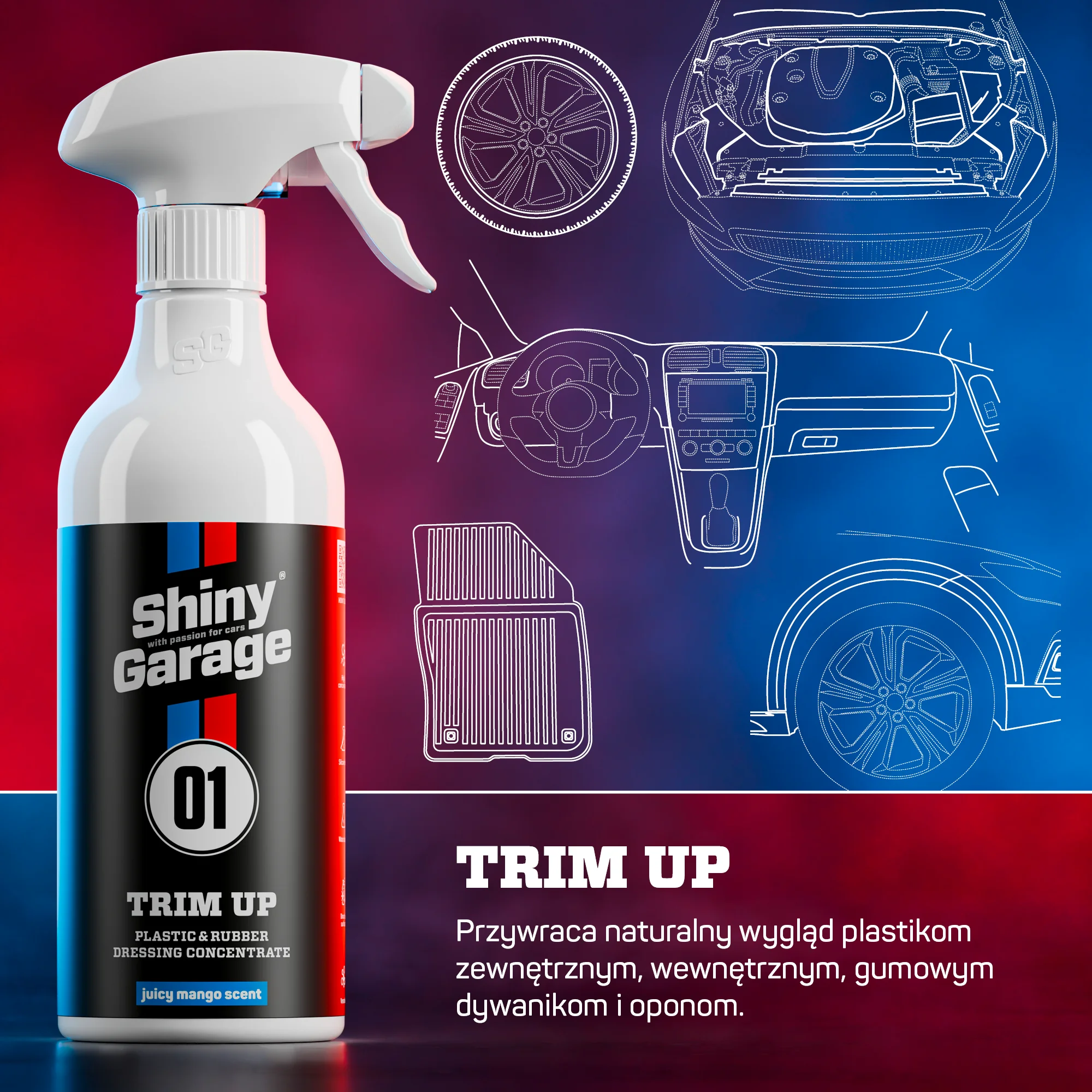 Shiny Garage Trim Up to wielozadaniowy dressing do opon, plastików i elementów gumowych. Dzięki wodnej formule bez silikonów zapewnia naturalny, matowy efekt bez tłustych śladów. Zabezpiecza powierzchnie przed promieniami UV, blaknięciem oraz zanieczyszczeniami. Efekt hydrofobowy ogranicza osadzanie się wody i brudu, a egzotyczny zapach soczystego mango sprawia, że praca z produktem to sama przyjemność.