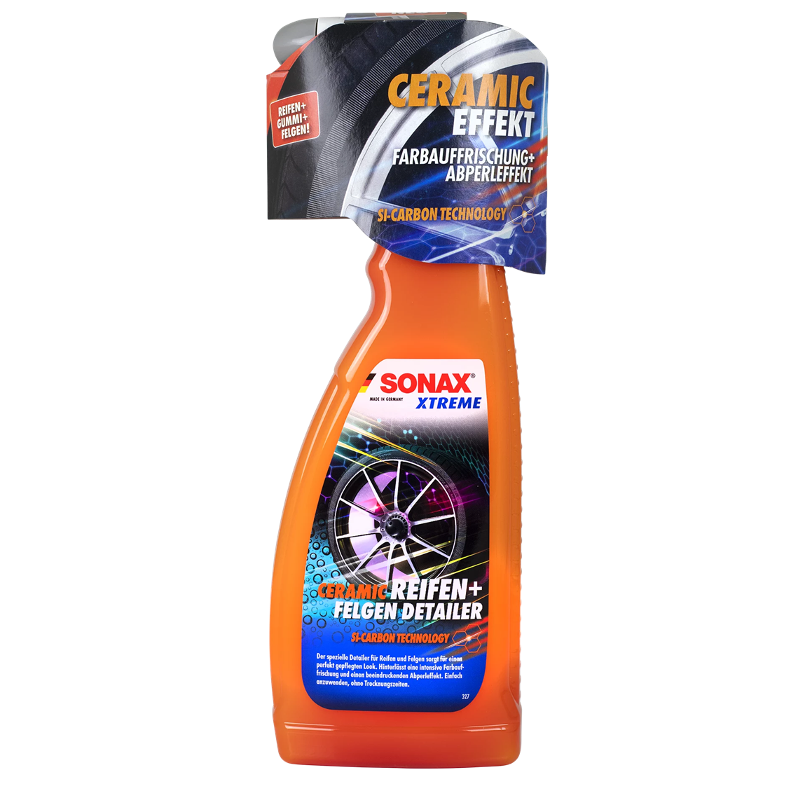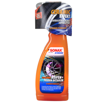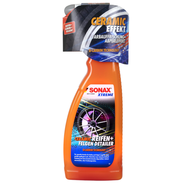 SONAX Xtreme Ceramic Tyre + Rim Detailer to innowacyjny preparat czyszcząco-zabezpieczający, stworzony specjalnie do pielęgnacji opon i felg samochodowych. Dzięki zaawansowanej technologii Si-Carbon, produkt wnika w powierzchnię, tworząc hydrofobową warstwę ochronną. Ta ultra-gładka powłoka skutecznie utrudnia osadzanie się kurzu, brudu oraz innych zanieczyszczeń, co znacznie ułatwia późniejsze mycie. Produkt zabezpiecza gumę przed szkodliwymi warunkami atmosferycznymi, blaknięciem, twardnieniem, pękaniem i brązowym nalotem. Felgi są chronione przed mikrorysami, pyłem hamulcowym i osadami.