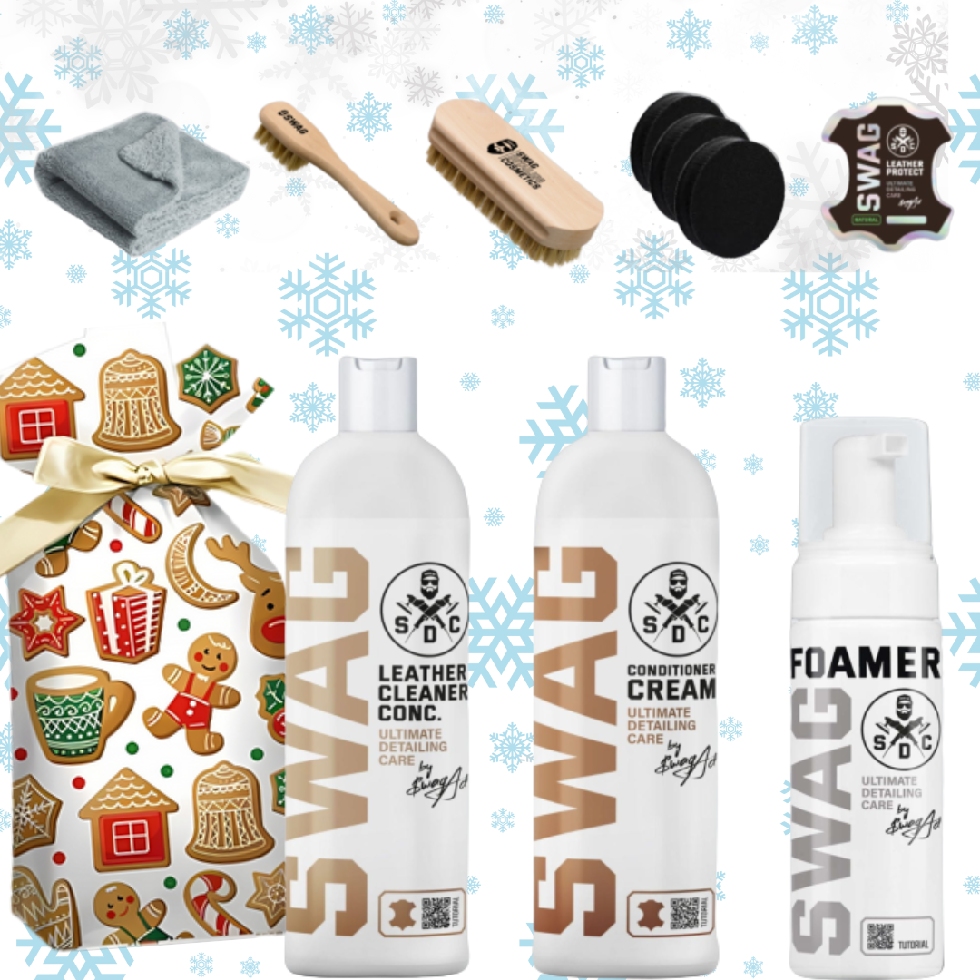 Swag LEATHER CARE SET to ekskluzywny zestaw kosmetyków i akcesoriów stworzony z myślą o kompleksowej pielęgnacji tapicerki skórzanej. Łączy profesjonalne produkty do czyszczenia i konserwacji z ergonomicznymi akcesoriami, umożliwiając precyzyjny detailing na najwyższym poziomie. Idealny dla Studiów Detailingowych oraz entuzjastów auto detailingu, którzy oczekują skuteczności, bezpieczeństwa i wyjątkowego efektu wizualnego.