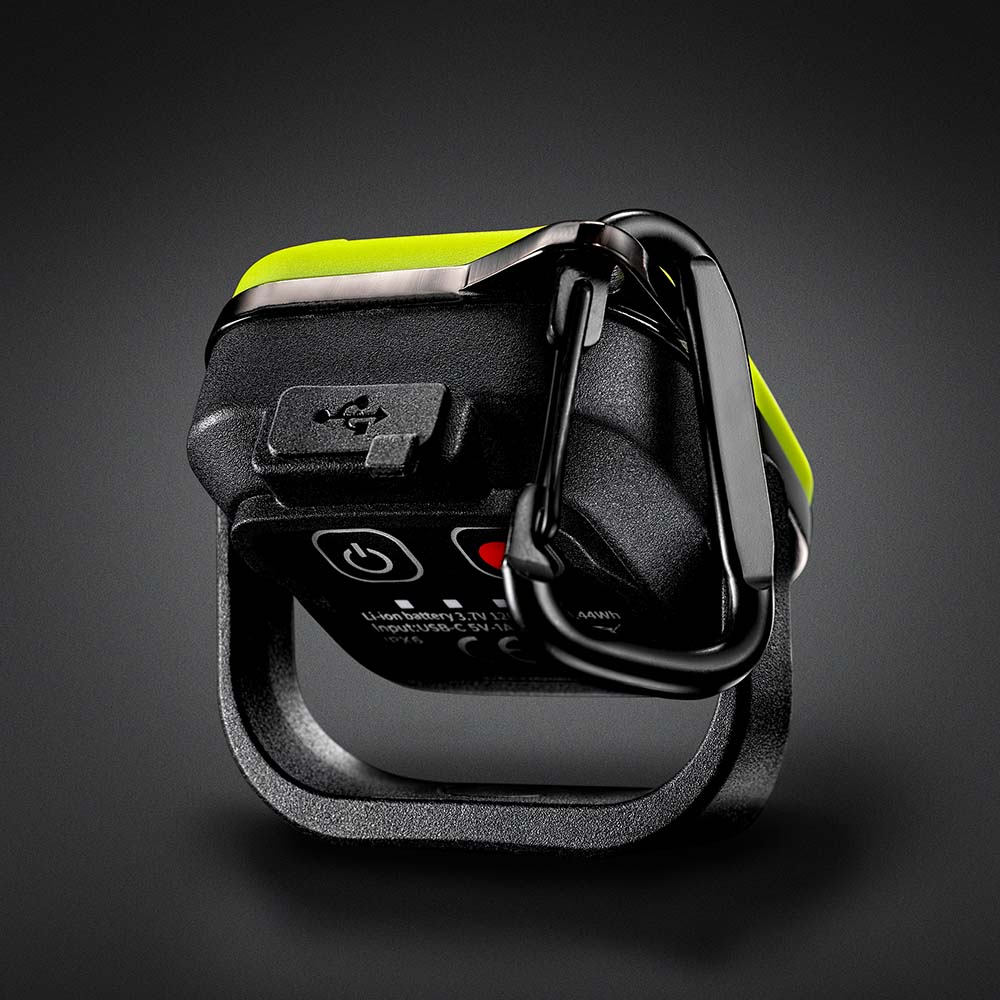 Karabińczyk, magnes i obrót 160° – wygodne mocowanie w dowolnym miejscu.