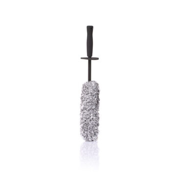 Długość całkowita wynosząca 38 cm sprawia, że jest to idealne narzędzie do czyszczenia mniejszych felg, skomplikowanych wzorów szprych, ciasnych wnęk oraz motocykli. Gęste mikrowłókna charakteryzują się wysoką gramaturą, dzięki czemu szczotka doskonale chłonie wodę z szamponem, zapewniając niezbędny poślizg podczas mycia. Jest to kluczowe dla ochrony felg lakierowanych na wysoki połysk (Gloss Black, Piano Black), chromowanych oraz polerowanych przed powstawaniem mikrozarysowań.