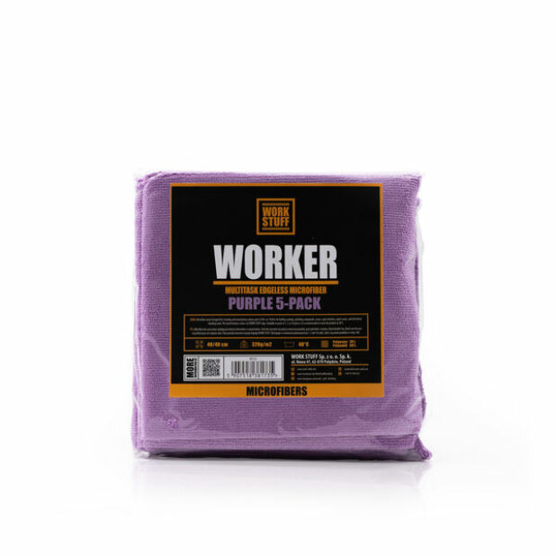 WORK STUFF Worker Purple to zestaw 5 miękkich, uniwersalnych mikrofibr 40×40 cm o gramaturze 320 GSM. Idealne do docierania wosków, powłok, past oraz prac wewnątrz auta. Laserowo cięte krawędzie zapewniają maksymalne bezpieczeństwo dla lakieru i delikatnych powierzchni.